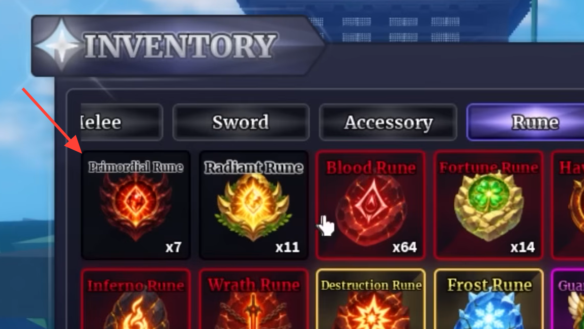 The Primordial Rune is a secret drop from the Infinite Tower and provides the highest damage boost of any rune in the game. Level it to 60 by grinding rune dungeons. No other rune comes close for a pure DPS setup.
