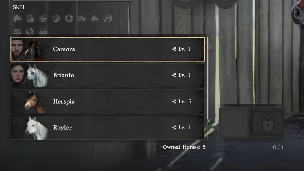 Press M to open the character menu and view your horse's stat breakdown in the bottom-left corner. Every horse has six stats, each ranging from 0.85 to 1.25 on standard mounts.