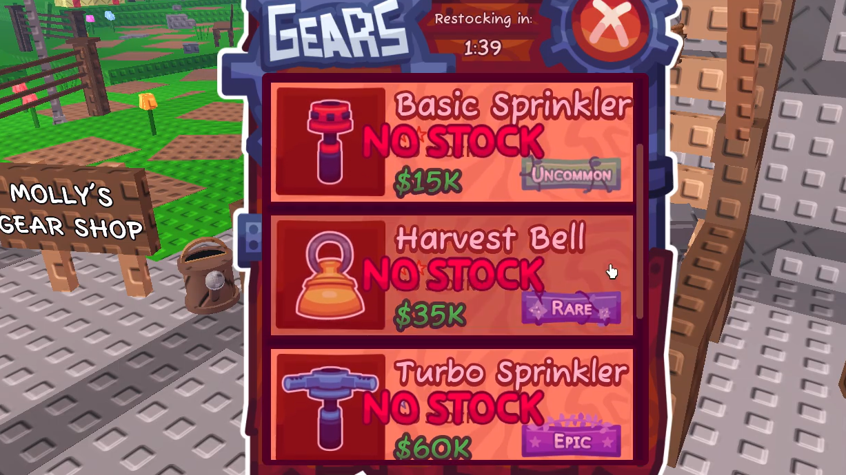 When available, the Harvest Bell is listed in the gear catalog, typically appearing under the Basic Sprinkler. There are two currencies accepted for the transaction: