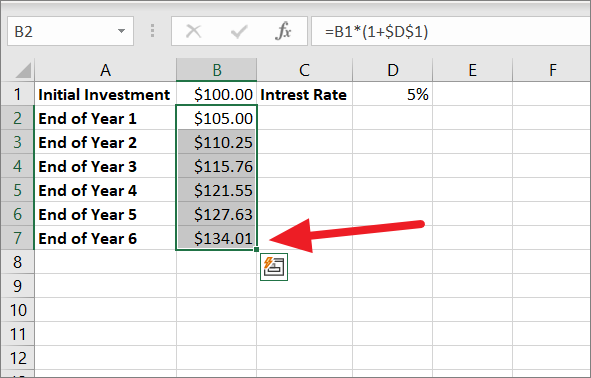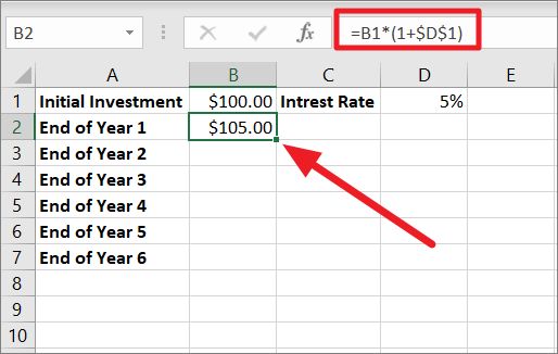 ==B1*(1+$D$1)Where B1 is the initial investment i.e. $100 and $D$1 is the interest i.e. 5%. As you can see, we fixed the reference to cell D1 with the $ sign because the interest remains the same every year and so it doesn’t change as we copy the formula in the next step.