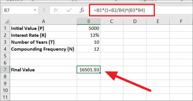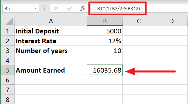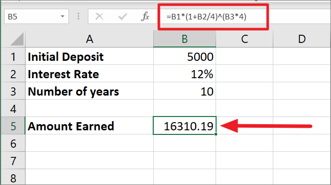 =B1*(1+B2/4)^(B3*4)In this formula, the interest rate of 12% is divided by 4 and its result of 0.03 is then added to 1. This gives us 1.03 which is raised to the power 40 (10*4) because 10 is the number of years and 4 is the number of times interest is compounded in a year. With 1.03 as the base number and 40 as the exponent, we get 3.27. At last, multiplying 3.27 with the initial amount of 5000 gives us the final amount of 16310.19.