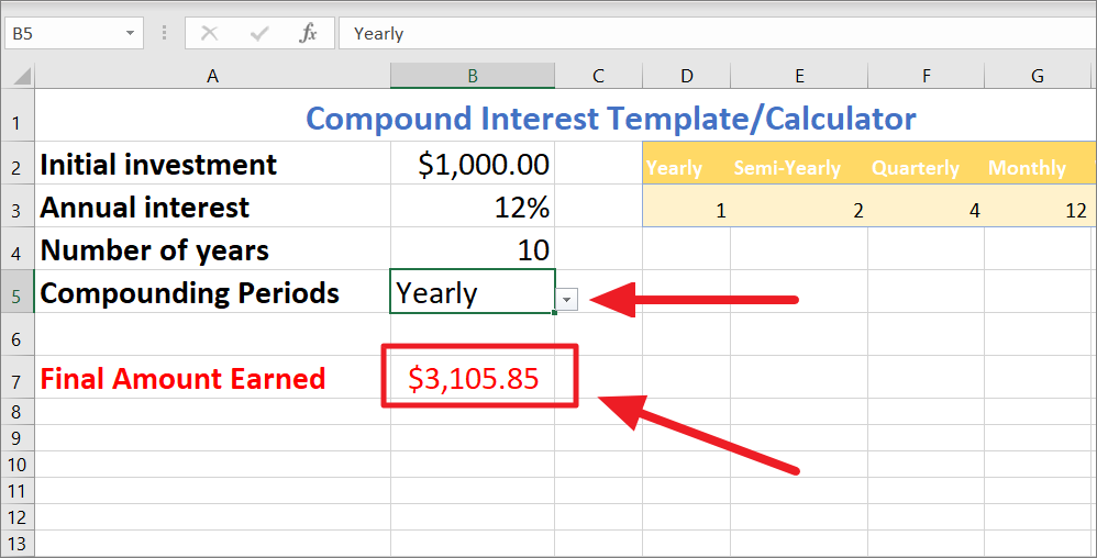 Instead of creating different formulas for different compounding periods, you can create an all-in-one excel template that helps to calculate compound interest no matter what your compounding periods are. Here’s the compound interest calculated for different compounding periods: