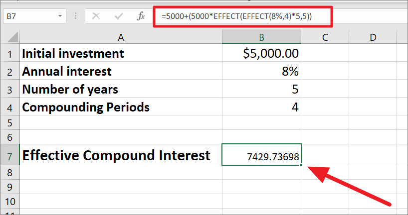 =B1*(1+B2/B4)^(B3*B4)The above formula is not that different from the previous formulas, but the only difference is that we referred to B4 as the N argument (number of times compounding occurs). Instead of manually entering the N argument in the formula, you can just change the compounding frequency in cell B4 (e.g. 4, 12, 52, etc.) and use the same formula for calculating compound interest with different periods.