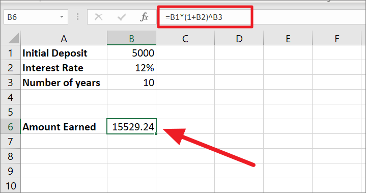 After that, the caret symbol (^) is used to raise the number or give exponents. The 112% is raised to the power 10 (10*1) as the number of years which results in 3.105848%. Finally, 5000 is multiplied by 3.105848 to get the future value of 15529.24. This is the final amount earned on the initial deposit of 5000 after 10 years at a 12% interest rate.