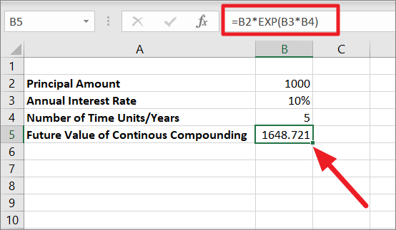 The rate of interest is multiplied by the number of time units (10%*5=0.5), then the EXP function returns the value of the constant e raised to the power of the number (0.5). After that PV (1000) is multiplied by the value of the constant (1.648721) which results in the continuous compounding amount of 1648.721.