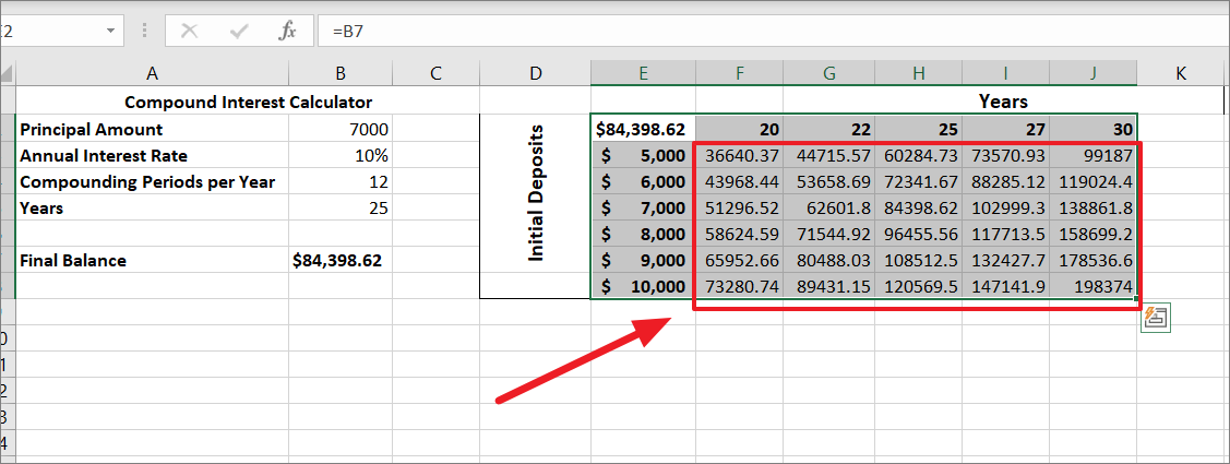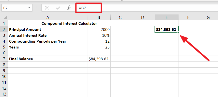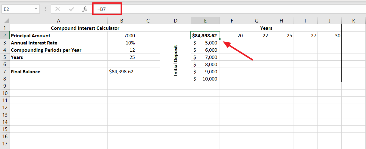 First, create a two-dimensional data table for two sets of variables. The top left corner cell should be the formula cell and it should be linked to your original formula cell. Here, we are linking cell E2 to the compound interest formula cell B7 with =B7.