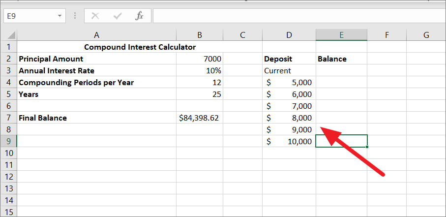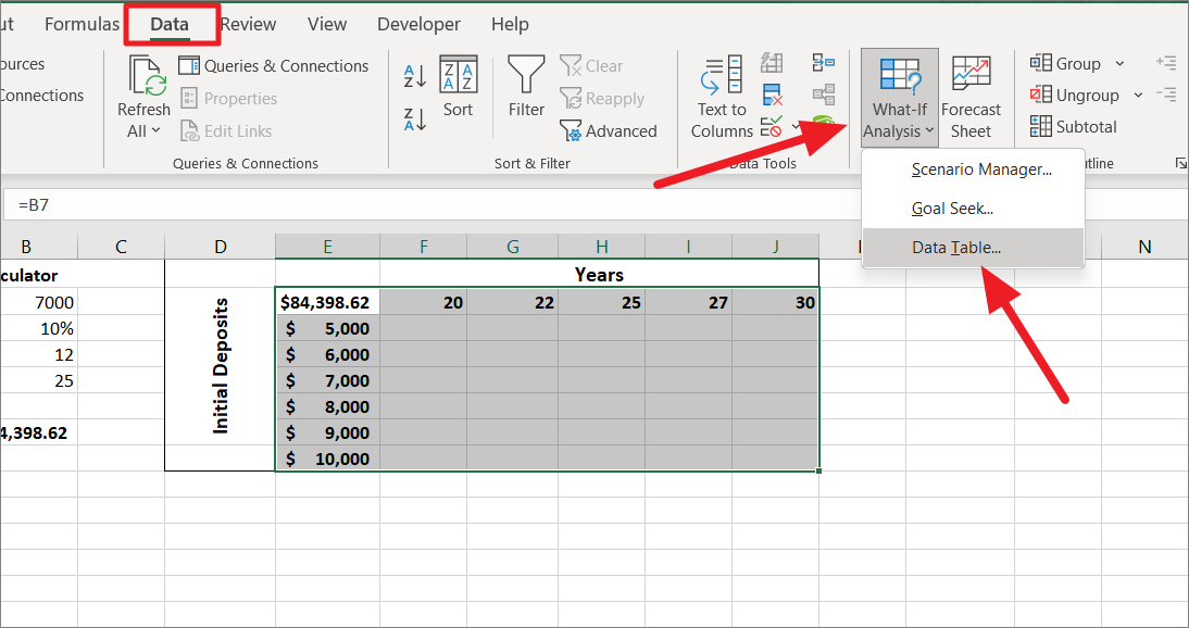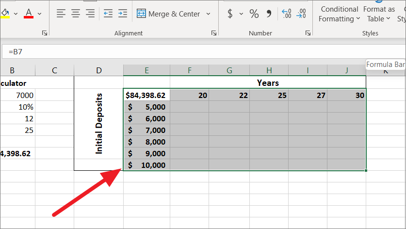 Now, let us do a What-If analysis using a one-variable data table to check what your savings will be in 25 years based on your initial deposit, ranging from $5000 to $10000.