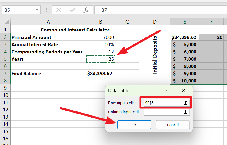 In the Data Table dialog box, click in the ‘Row input cell’ field, and select the cell containing the Years value (B5).