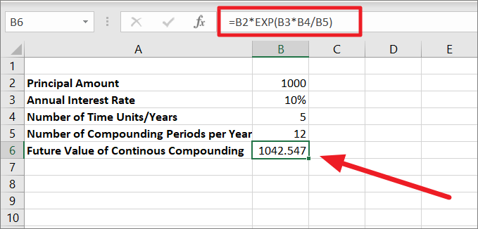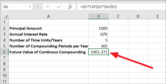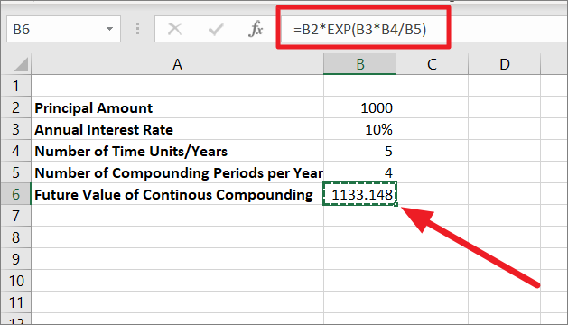 =B2*EXP(B3*B4/B5)In the above formula, B2 is the Principal amount (PV), B3 is the rate of interest (r), B4 is the number of time years (n), and B5 is the number of compounding periods per year.
