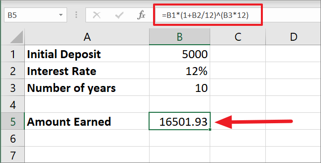 =B1*(1+B2/12)^(B3*12)Since the interest is compounded every month of the year, the 12% interest rate is divided by 12 which gives us 0.01. Then 1 is added to 0.01 equals 1.01.
