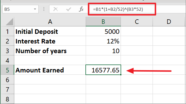 =B1*(1+B2/52)^(B3*52)Since the interest is compounded every month of the year, the 12% interest rate is divided by 52 which gives us 0.002308. Then 1 is added to 0.002308 equals 1.002308.