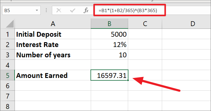 Now, 1.000328767 is calculated at the power 10*365 (number of years time number of compounding periods) which equals 3.31946071. Finally, 3.31946071 is multiplied by $5000 which makes the final amount $16597.31.
