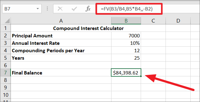 Compound Interest = Final Amount - Initial AmountIf you wish to calculate the total interest you earned with compounding, simply subtract the initial amount (B1) or the start amount from the final amount or future value(B7).