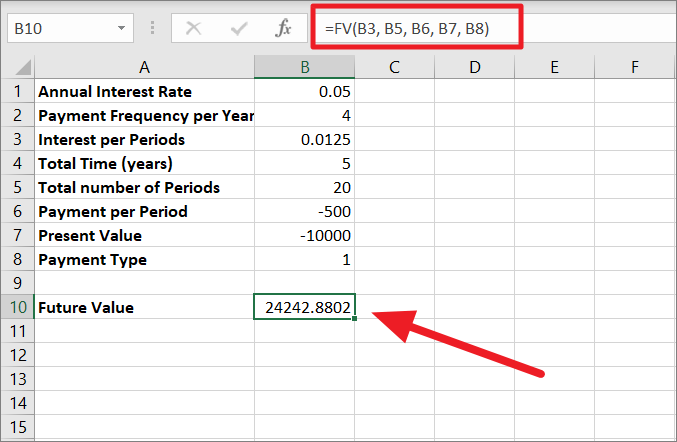 =FV(B3/B4,B5*B4,,-B2)In the below spreadsheet,