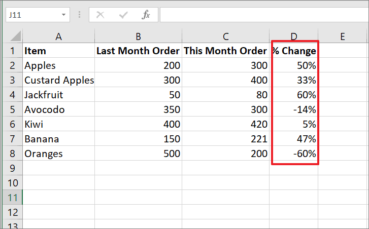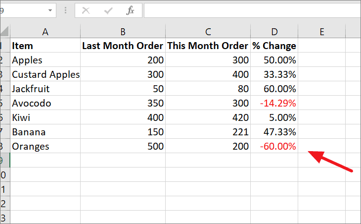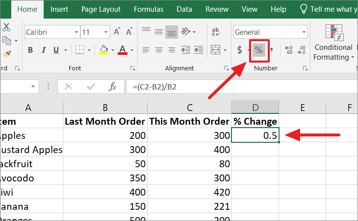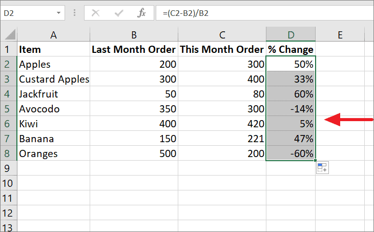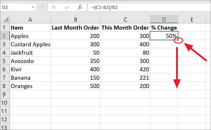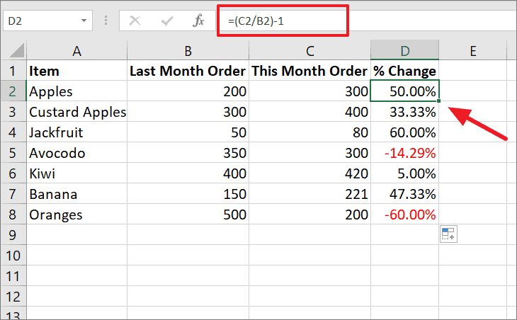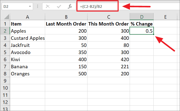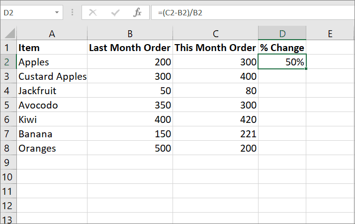 For example, you ordered a certain number of fruits last month and this month you ordered more than what you ordered last month, you can enter the below formula to find the percentage difference between the two orders: