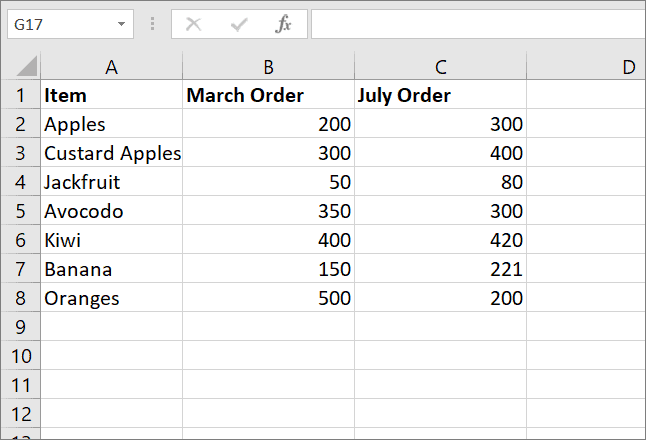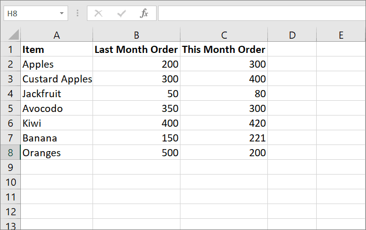 Let’s take a look at this list of hypothetical fruit orders with column B contains the number of fruits ordered last Month and column C contains the number of fruits ordered this month: