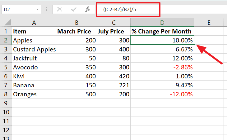 As you can see, the percentage change for ‘Apples’ is increased by 50%, so the value is positive. The percentage for ‘Avocodo’ is decreased by 14%, hence the result is negative (-14%).