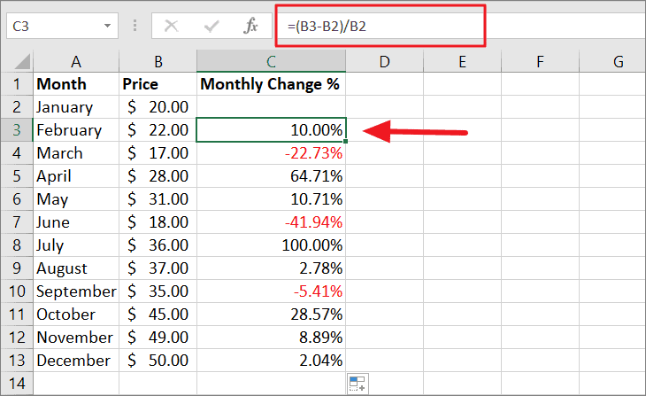 Since we need to find the percentage of growth for February (B3) from the price of January (B2), we need to leave the first row blank because are not comparing January to the prior month. Enter the formula in cell C3 and press Enter.