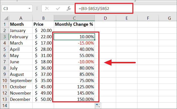 You can also calculate the percentage change for each month compared to January (B2). To do this, you need to make that cell an absolute reference by adding the $ sign to the cell reference, e.g. $C$2. So the formula would look like this: