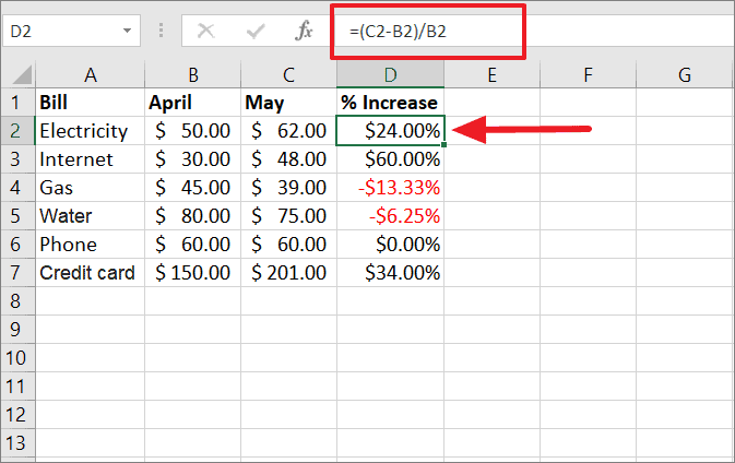 For example, you have a list of bills and their amounts for two months (April and May). If your bills for April month are increased in May month, then what is the percentage increase from April to May? You can use the below formula to find out: