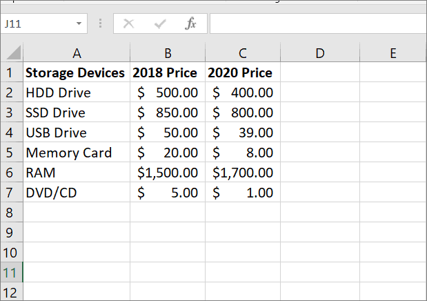 Let’s assume you have this list of storage devices and their prices for two years (2018 and 2020).