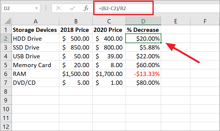 Here, we subtract the 2018 price (B2) from the 2020 price (C2) and divide the sum by the 2018 price. Then, we copy the formula down to other cells to find the percentage decrease for other devices.