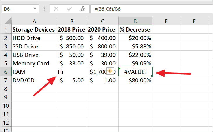 - #VALUE: Excel throws this error when you’ve entered a value that is not a supported type or when cells are left blank. This often can occur when an input value contains spaces, characters, or text instead of numbers.