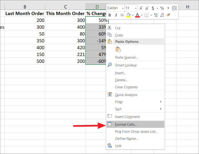 You can also use another formula to calculate percentage change between two values (Last Month Order and This Month Order):