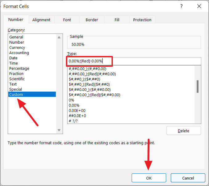 In the Format Cells window that appears, click on ‘Custom’ at the bottom of the left menu and type the below code in the ‘Type:’ text box: