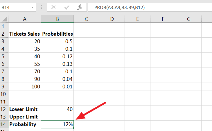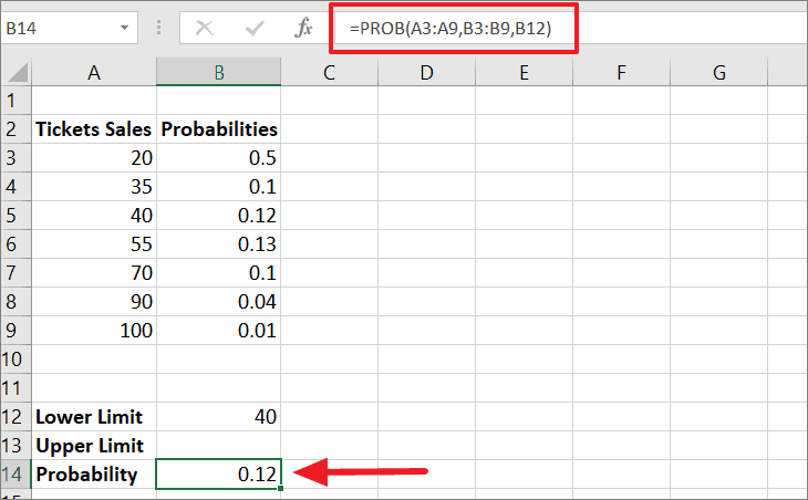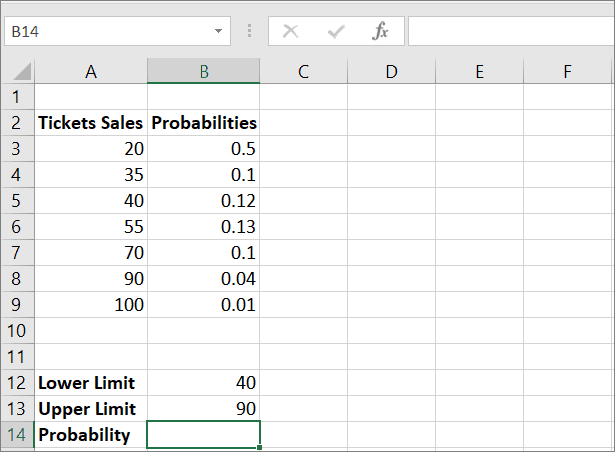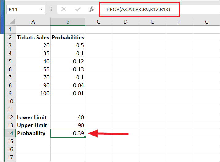 Where A3:A9 is the range of events (ticket sales) in numerical values, B3:B9 contains the chance of getting the respective sales quantity from column A, B12 is the lower limit, and B13 stands for the upper limit. As a result, the formula returns the probability value of ‘0.39’ in cell B14.