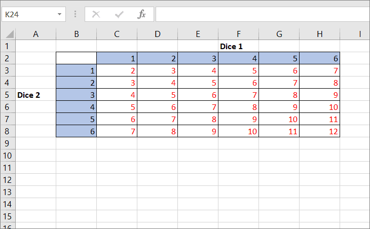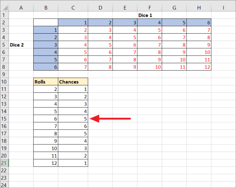 When you roll two dices, you would get the sum of numbers between 2 and 12. The numbers in the red are the sum of two dice numbers. The value in C3 is equal to the sum of C2 and B3, C4=C2+B4, and so on.