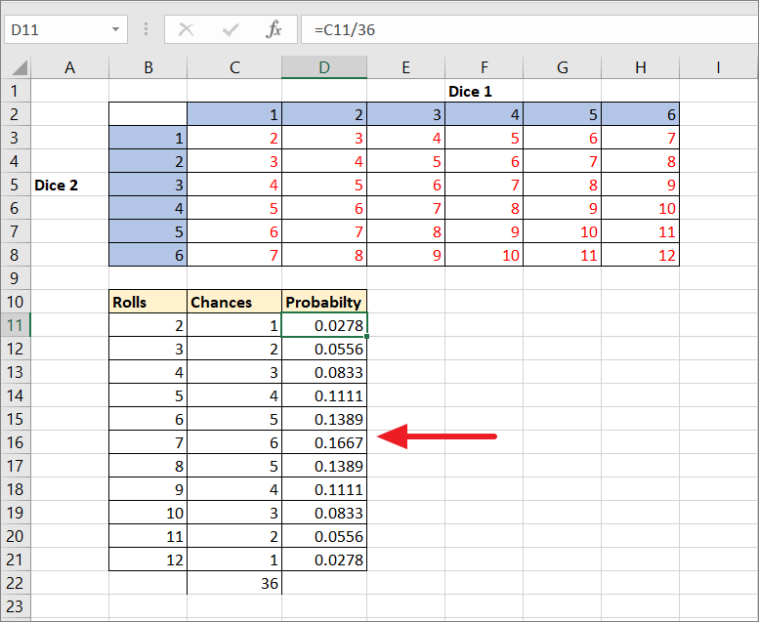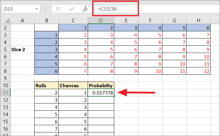 Now, we need to calculate the individual probabilities of the sum of numbers occurring on the rolls. To do that, we need to divide the value of each chance by the total value of chances, which is 36 (6 x 6 = 36 possible rolls). Use the below formula to find individual probabilities: