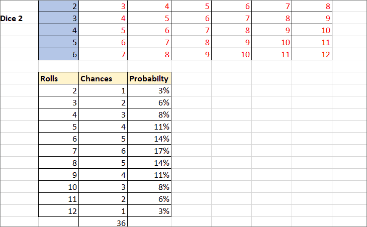 We need to create another table with the sum of rolls in one column and their chance of getting that number in another column. We need to enter the below roll chance formula in cell C11: