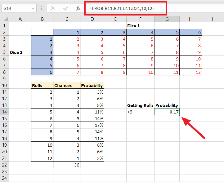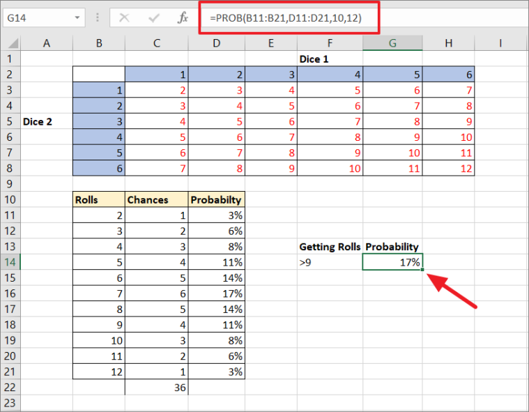 Now, let’s say you want to find the probability of getting rolls higher than 9. You can use the below PROB function to do that: