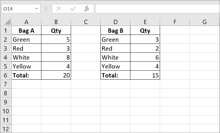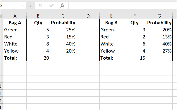 For example, suppose you have two bags full of balls: ‘Bag A’ and ‘Bag B’. Bag A has 5 green balls, 3 white balls, 8 red balls, and 4 yellow balls. Bag B has 3 green balls, 2 white balls, 6 red balls, and 4 yellow balls.
