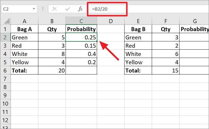 Where B2 is the number of red balls (5) divided by the total number of balls (20). Then, copy the formula to other cells. Now, you got individual probabilities for picking up each color ball from bag A.
