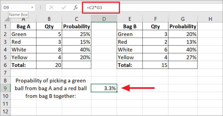 As you can see, the probability of picking a green ball from bag A and a red ball from bag B simultaneously is 3.3%.