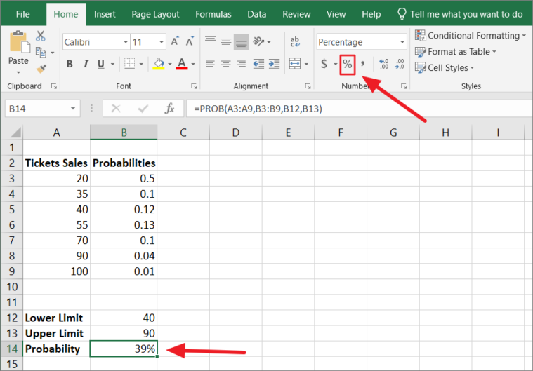 Then, click on the ‘%’ icon in the Number group of the ‘Home’ tab as shown below. And you will get ‘39%’, which is the probability of making the ticket sales between 40 and 90.
