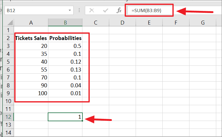 Once the numerical values (Ticket Sales) and their probabilities of getting them are entered, you can use the SUM function to check whether the sum of all probabilities adds up to ‘1’ or 100%. If the total value of probabilities is not equal to 100%, the PROB function will return the #NUM! error.