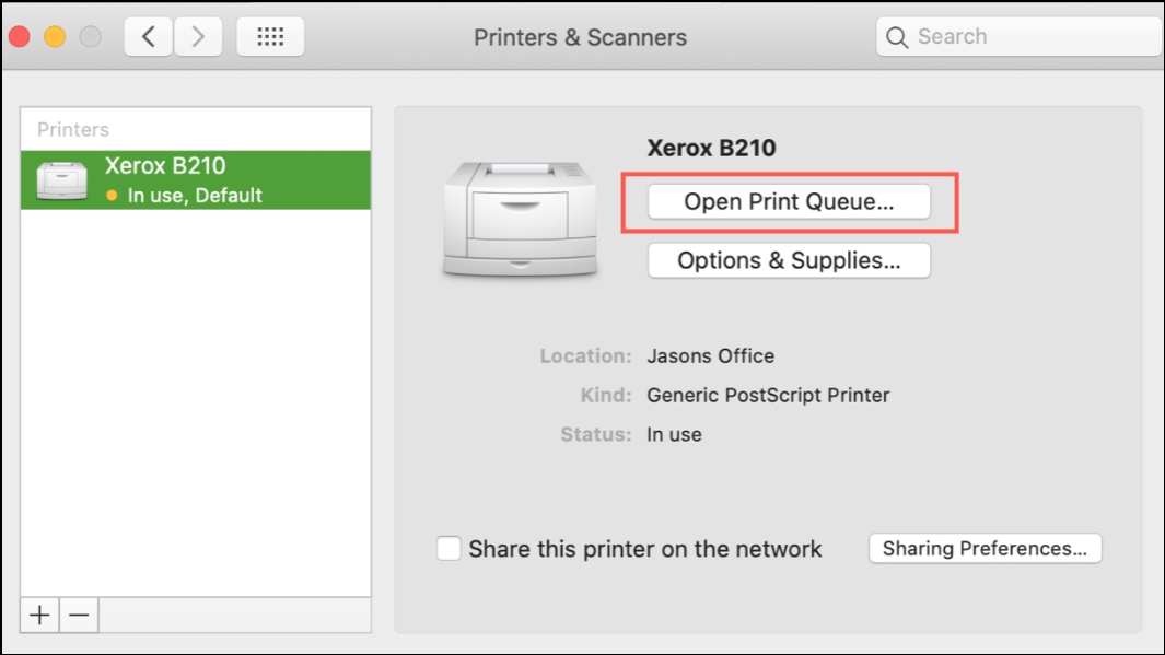 Step 2: Click Printers & Scanners. Select your printer from the list, then click Print Queue... or Open print queue....