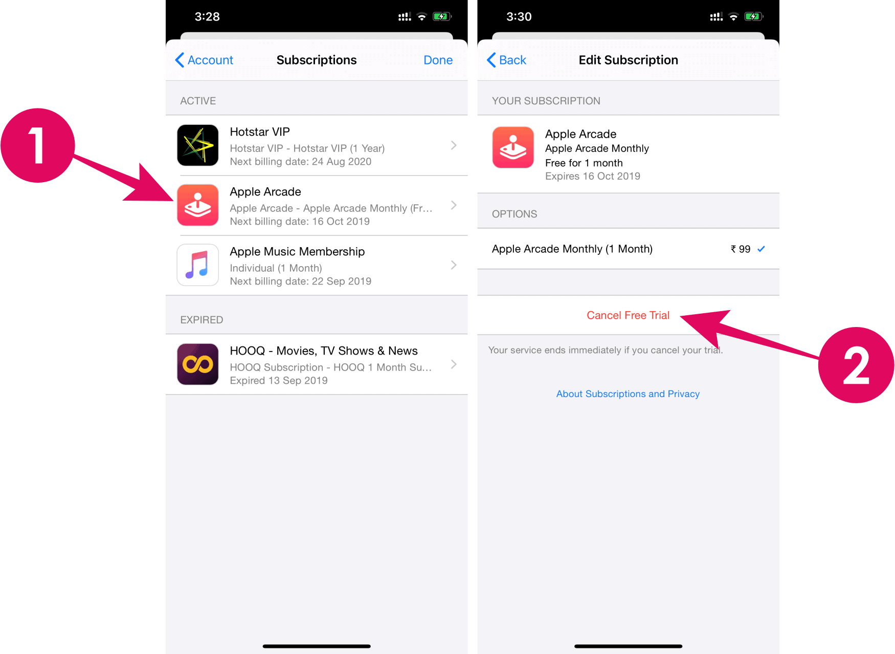 Tap “Apple Arcade” from the list of active subscriptions, and then tap “Cancel free trial” to cancel the subscription. If you get a confirmation pop-up, tap “Confirm” to complete your request.