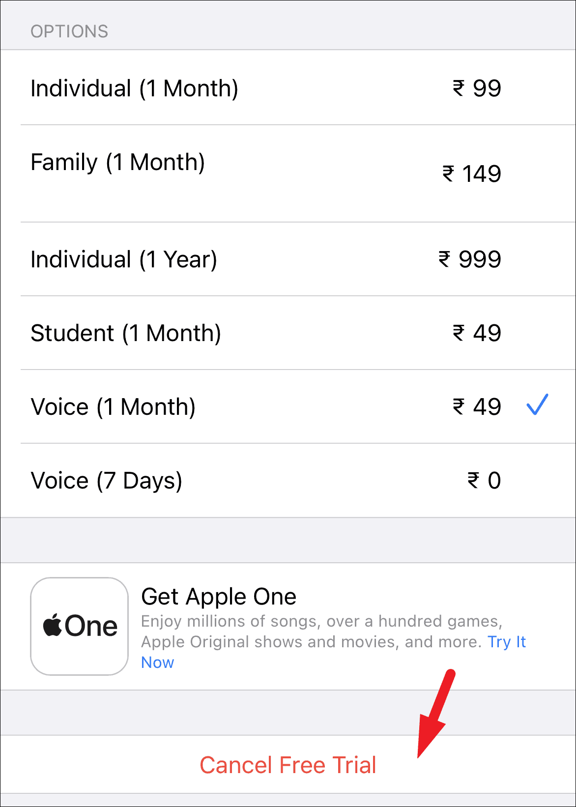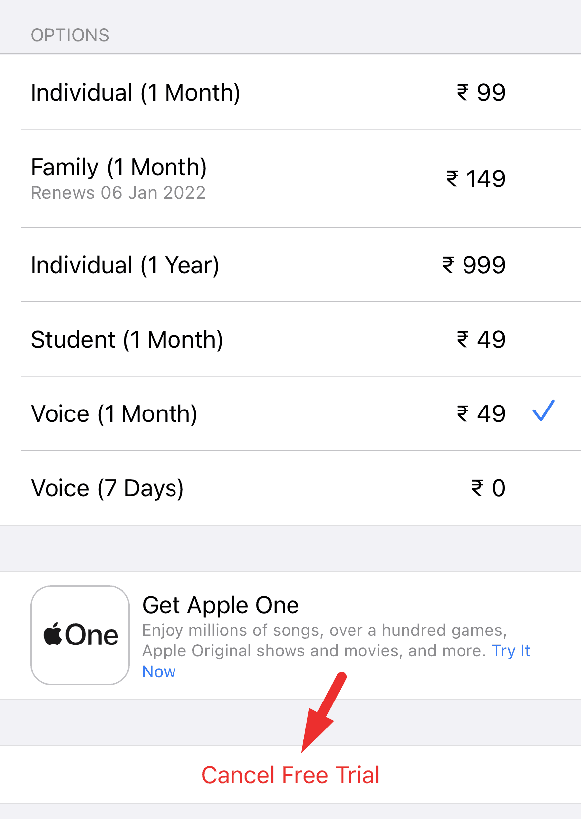 Now on the next screen, you will be able to see all your Apple subscriptions, locate the ‘Apple Music’ tile and then tap on the ‘Cancel Free Trial/Cancel Trial’ button present under the ‘Options’ section. This will bring up a prompt on your screen.