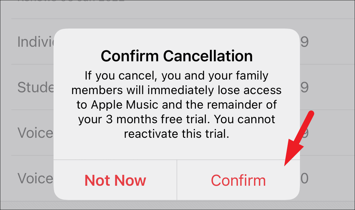 Finally, tap on the ‘Confirm’ option on the prompt to cancel your subscription to Apple Music. The service may still continue till your next billing date.