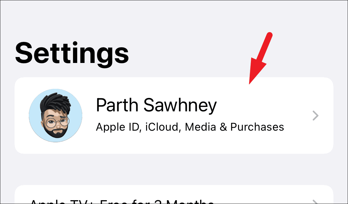Then, tap on your Apple ID card present at the top of the Settings screen to continue.