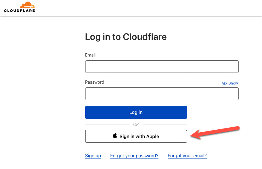 From any browser on your computer or iPhone, go to cloudflare.com. Then, sign in to your account. If you used your Apple ID to sign in while purchasing the domain, then click on ‘Sign in with Apple’ to log in.