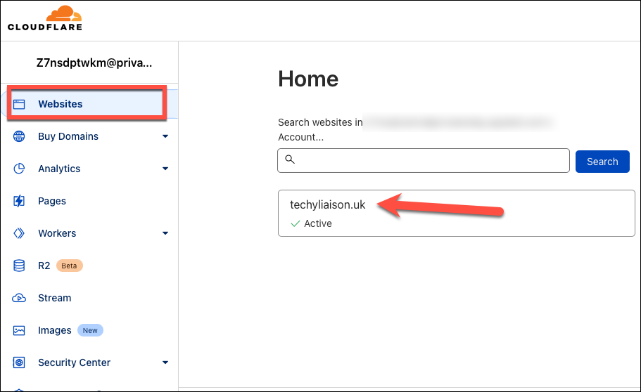 Make sure you’re on ‘Websites’ from the navigation menu on the left. You’ll see your active domain(s) on the right. Click the one you want to cancel.