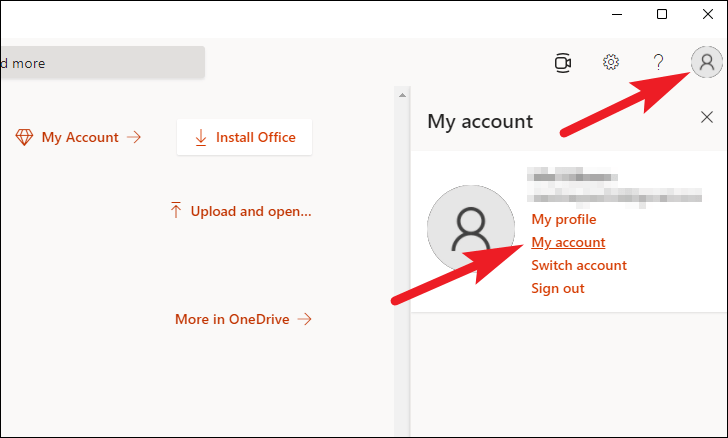 Then, click on your account profile picture and choose the ‘My account’ option from the list. This will redirect you to Microsoft’s website by launching it on your system’s default browser.