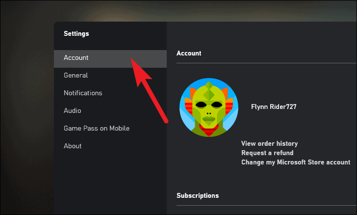 Select the ‘Account’ tab on the left sidebar of the Xbox app window.