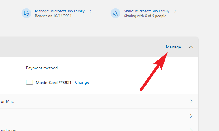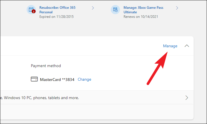 Click on the ‘Manage’ option under the ‘Subscriptions’ section. This will redirect you to the Microsoft website by launching the default browser on your Windows PC.
