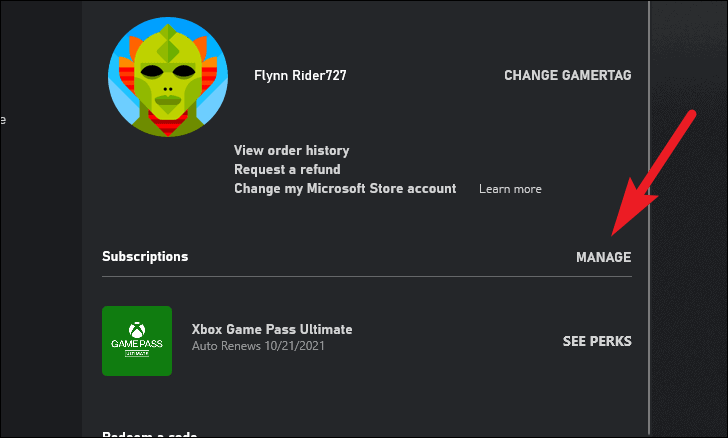 Now, click the ‘Manage’ option under the ‘Xbox Game Pass’ section on the ‘Services & subscriptions’ page.